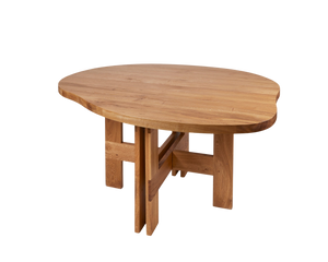 The sculptural tabletop is made of solid oak and features an organic shape with fluid lines.